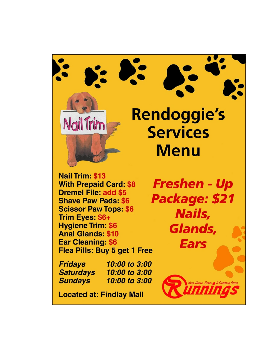 Locally owned and operated by Sandy Winkle, Rendoggie's now serves you from our new location at Running's in the Findlay Mall located at 1800 Tiffin Ave. Pick & Choose from our menu of low cost Walk-UP essential grooming services.